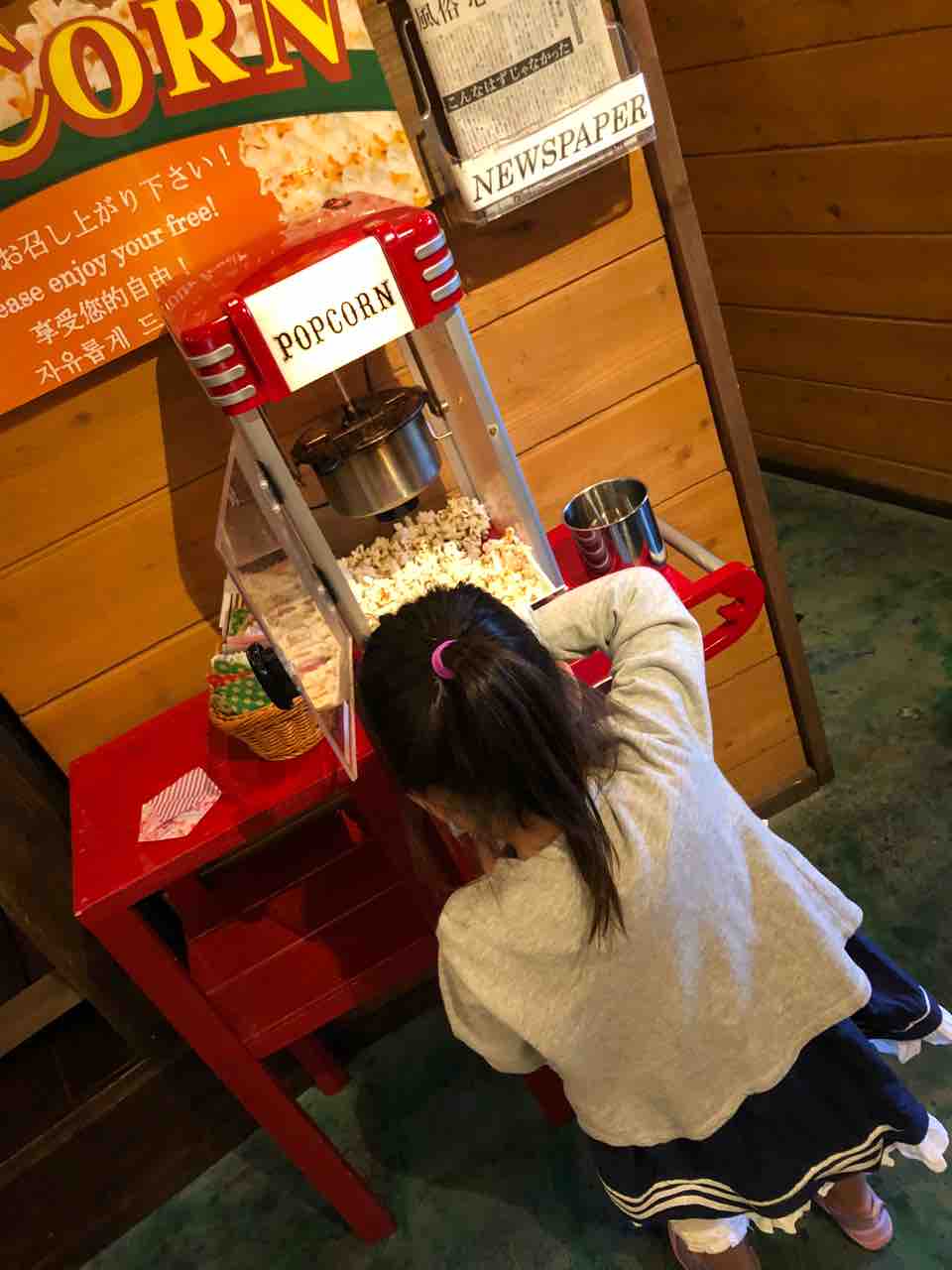 で、日頃お菓子をあまり与えない反動が出ているだけ〜と思いきやこのポップコーンがなかなかの塩味がして、大人でもついつい手を伸ばしてしまう美味しさがありました〜