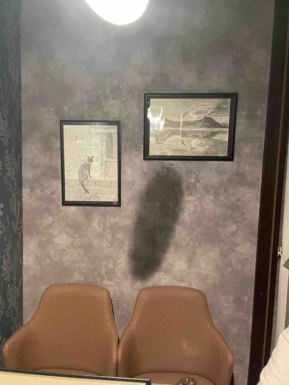アイソの席が壁際で、なんとその絵かバックの壁紙と全く違和感なくマッチ…